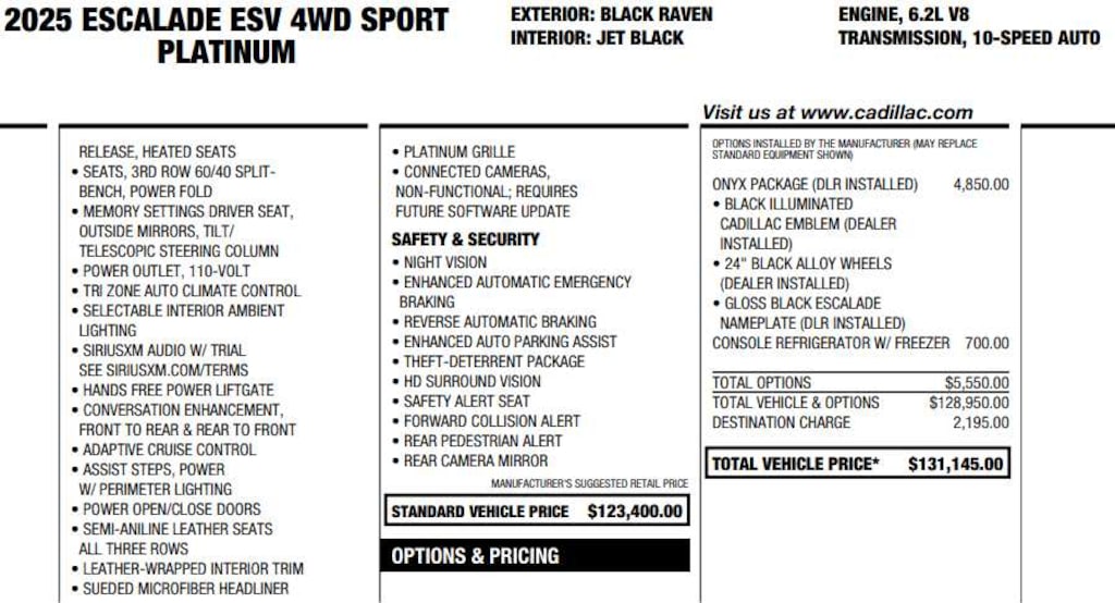 LPO, ONYX PACKAGE includes (RIK) Gloss Black Escalade nameplate, LPO, (SQO) 22" Forged Multi-Spoke alloy wheels with Satin Graphite finish and Laser Etching, LPO or (5FE) 24" Black alloy wheels, LPO and (R88) Black illuminated Cadillac emblem, LPO (RWD models include (SQO) 22" Forged Multi-Spoke alloy wheels with Satin Graphite finish and Laser Etching, LPO. 4WD models include (5FE) 24" Black alloy wheels, LPO.), CONSOLE REFRIGERATOR freezer mode, covered storage, large and small storage bins, dual cup holders, second row electronic climate and heated seat controls. Also includes USB A/C ports, ENGINE, 6.2L V8 WITH DYNAMIC FUEL MANAGEMENT Direct Injection and Variable Valve Timing, includes aluminum block construction (420 hp [313.2 kW] @ 5600 rpm, 460 lb-ft of torque [623.7 Nm] @ 4100 rpm) (STD), TRANSMISSION, 10-SPEED AUTOMATIC electronically controlled with overdrive, tow/haul mode and tap up/tap down shifting (STD).